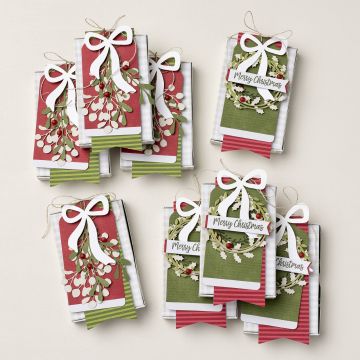 Share some holiday joy one treat at a time with the Wrapped in Cheer Paper Pumpkin Past Kit. These festive tags and coordinating boxes are sized just right for gift cards or tasty little goodies! Double-sided greenery pieces and textured paper bows give each project an elegant, upscale finish. The kit comes with everything you need for fun holiday crafting, including foldable boxes, precut paper pieces, red dot embellishments, linen thread, and a Christmas stamp set.